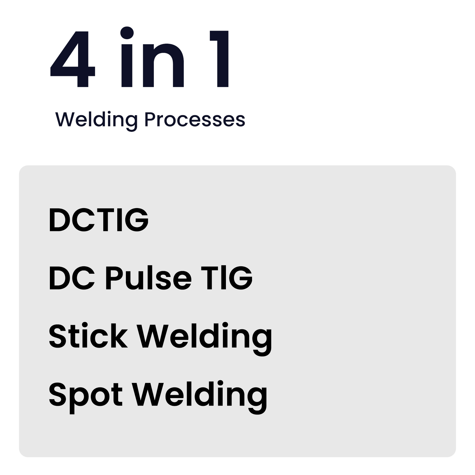 DC TIG or DC Pulse TIG supports steel, stainless steel, copper, bronze, and other ferrous and non-ferrous metals suitable for direct-current welding. Stick mode accommodates rutile, stainless steel, basic, and bare electrodes up to 5.0 mm.